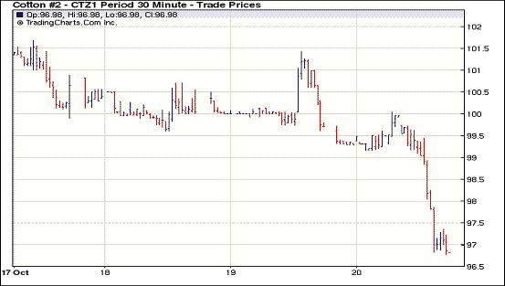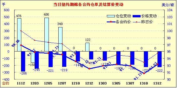受全球棉花需求前景不定、歐債危機缺乏信心及美棉出口不佳影響,10月20日紐約期棉全面大幅收跌,主力1112月合約結算價96.86美分/磅,跌286點,1203月合約結算價95.42美分/磅,跌245點;其他遠期合約也均大幅收跌,跌幅111-222點不等。當日市場早盤震蕩走高,主力1112月合約上漲至當日最高點100.04美分/磅(+32點);后美棉出口利空對期棉形成打壓,主力合約跌破前一日低點99.60美分/磅,至當日最低點96.78美分/磅,為近四周以來最低,震蕩幅度達326點;尾盤時受買盤支撐回補部分跌幅,盤終大幅收跌。昨日美元指數(shù)走弱、外圍谷物市場走強對期棉形成一定支撐,但由于全球棉花需求情景不定,市場對歐債危機的解決缺乏信心及美棉出口不佳(至10.7-10.13一周美國累計凈簽約出口棉花161萬噸,占美國農(nóng)業(yè)部預測的64%;累計裝運23噸,占USDA預測的9%,總簽約量的14%)等因素影響,期棉大幅走低。