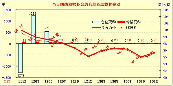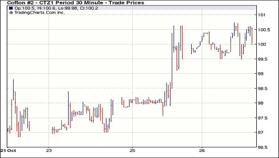 10月26日,受經(jīng)濟層面利好及美國股市強勢上揚支持,紐約期棉連續(xù)第四個交易日收漲,主力1112月合約結(jié)算價100.32美分/磅,漲64點,1203月合約結(jié)算價98.91美分/磅,漲60點;其他遠期合約也小幅收漲。當日市場早盤缺乏方向指引圍繞1美元上下震蕩,主力1112月合約最高至100.73美分/磅(+105點);后外圍谷物及原油市場走低導致期棉下跌,尾盤經(jīng)濟層面消息利好促市場再次上揚,盤終主力合約自10月18日(100.18美分/磅)以來首次收于1美元之上。在昨日的峰會上,歐盟未就希臘債務達成一致對市場造成打壓,但在中國可能投資歐元區(qū)救助基金的消息傳出后,投資者對歐洲領(lǐng)導人抑制債務危機能力的樂觀情緒升溫,促使美國股市及期棉上漲。