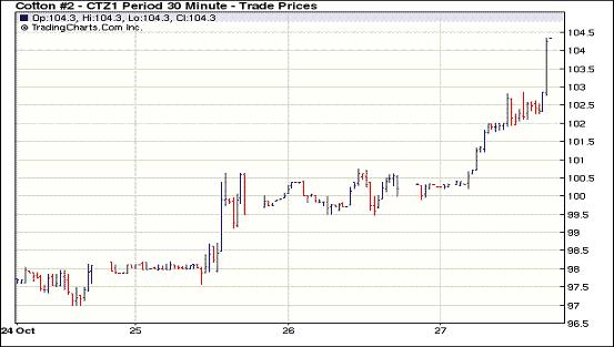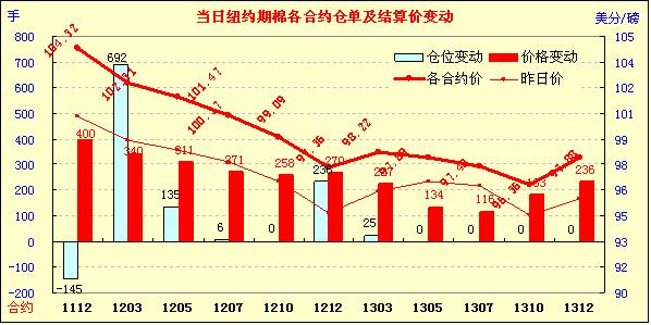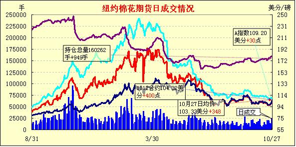 10月27日受歐元區(qū)達(dá)成協(xié)議提振及基本面美棉出口利好支持,紐約期棉連續(xù)第五個(gè)交易日上漲,主力1112月合約結(jié)算價(jià)104.32美分/磅,漲400點(diǎn),1203月合約結(jié)算價(jià)102.31美分/磅,漲340點(diǎn);其他遠(yuǎn)期合約也大幅收漲。當(dāng)日市場(chǎng)早盤平穩(wěn)開(kāi)盤,因歐洲領(lǐng)導(dǎo)人達(dá)成的解決歐債危機(jī)的協(xié)議令投資者歡欣鼓舞,促使買盤大量涌入,期棉持續(xù)上漲;后美棉出口周報(bào)的公布促使投機(jī)買盤再次涌入,尾盤時(shí)主力1112月合約至漲停板,盤終各合約均大幅告漲。因歐元區(qū)協(xié)議為希臘主權(quán)債務(wù)減值、增強(qiáng)金融業(yè)以及阻止債務(wù)危機(jī)蔓延等工作奠定了基礎(chǔ),昨日歐美股市大幅飆升,歐元兌美元升至七周來(lái)的最高水平,黃金和白銀期貨價(jià)格漲至五周高點(diǎn),經(jīng)濟(jì)層面利好支持期棉持續(xù)上漲。此外,美棉出口大量增加(10.14-10.20一周美國(guó)凈簽約出口本年度陸地棉87339噸,其中中國(guó)凈簽約本年度陸地棉89970噸),也為期棉帶來(lái)支持。