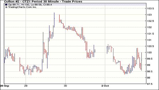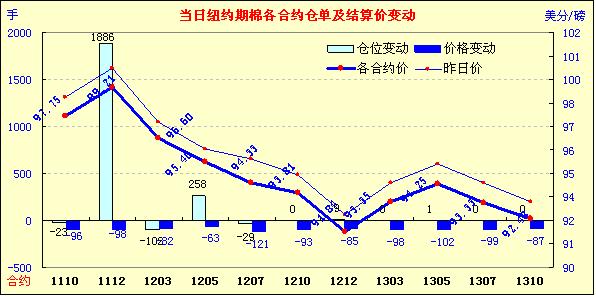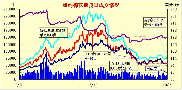 歐洲在應對主權(quán)債務危機問題上面臨困境,引發(fā)了市場對該國或許無法獲得救助資金以避免債務違約的擔憂,美國股市下挫,原油期貨大跌,美元繼續(xù)走強。受外圍市場影響,10月3日,紐約期棉先抑后揚,收于陰線。主力12月合約早盤一路下滑,由100.65美分下滑240點至98.25美分,之后在買盤支撐下回升,陰收于99.21美分。主力合約繼續(xù)增倉1886手,