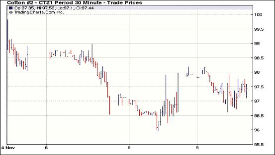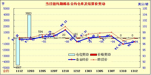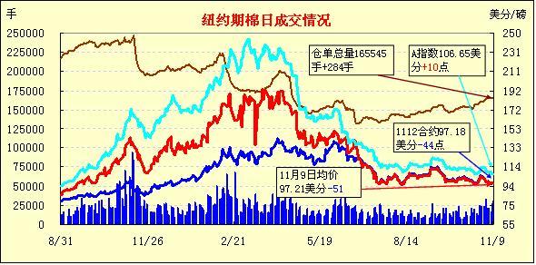 11月9日受意大利債務憂慮拖累,美元走高,歐美股市及大宗商品市場普遍下挫,紐約期棉全面收跌,主力1112月合約結(jié)算價97.18美分/磅,跌44點,1203月合約結(jié)算價97.14美分/磅,跌49點。當日市場開盤震蕩走高,主力1112月合約最高至98.18美分/磅(+56點);后美元走高及股市、外部商品市場走低連累期棉下滑,該合約最低點至97.62美分/磅,震蕩幅度156點;尾盤時受買盤支撐回補部分跌幅,盤終該合約小幅收跌,其他遠期合約也以告跌收盤,跌幅34-94點不等。美國農(nóng)業(yè)部(USDA)昨日公布的全球供需預測報告對市場影響不大,意大利國債收益率飆升以及關于歐元區(qū)的新一輪擔憂成為各方關注焦點。美國股市昨日大幅下挫,創(chuàng)9月中旬以來的最大單日跌幅;歐洲股市大幅走低;外部商品市場也全面下挫,期棉受連累呈下跌趨勢,未來能否上行還需關注歐元區(qū)債務危機的進一步發(fā)展。