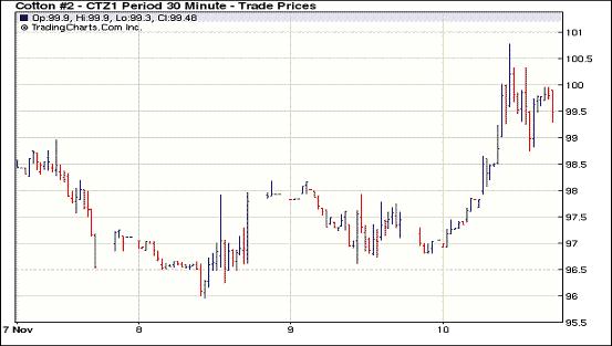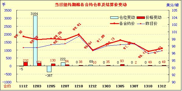 11月10日受美棉出口利好及經(jīng)濟層面歐債危機解決出現(xiàn)進展、美國就業(yè)市場改善等因素刺激,紐約期棉全面收漲,主力1112月合約結(jié)算價99.50美分/磅,漲232點,1203月合約結(jié)算價98.88美分/磅,漲174點。市場開盤窄幅震蕩,1112月合約最低點至96.81美分/磅;后美棉出口周報數(shù)據(jù)利好及市場對經(jīng)濟層面預(yù)期樂觀支撐期棉持續(xù)上漲,該合約自11月2日以來首次突破1美元,最高至100.78美分/磅,震蕩幅度397點;尾盤時買盤獲利了結(jié)回吐部分漲幅,盤終該合約收漲200余點。外部商品市場漲跌不一,谷物及油料走低,原油市場走高。10.27-11.3一周美國凈簽約出口本年度陸地棉226343噸,裝運24313噸(較前一周增19%,較近四周平均值增31%);其中中國凈簽約本年度陸地棉225912噸,裝運11090噸,這對期棉上漲形成支撐。此外,美國上周首次申請失業(yè)救濟人數(shù)降至七個月來最低水平,表明疲軟的美國就業(yè)市場出現(xiàn)好轉(zhuǎn);歐債危機方面意大利國債收益率回落,希臘周四任命原歐洲央行(European Central Bank)副行長帕帕季莫斯(Lucas Papademos)為新總理,從而為該國獲得下一批救助鋪平道路,市場認為歐債危機解決進程出現(xiàn)好轉(zhuǎn),這也是推動期棉上漲的主要原因。
