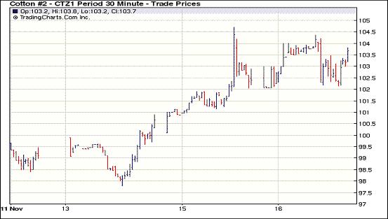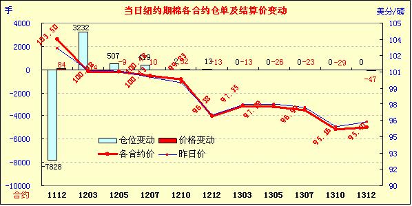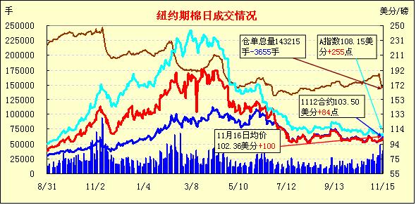 11月16日受歐債危機前景不確定及美元企穩(wěn)、美股走低影響,外部商品市場漲跌不一,紐約期棉漲跌互現(xiàn),盤終近期1112月合約收于103.50美分/磅,漲84點,主力1203月合約結(jié)算價100.48美分/磅,跌14點。當(dāng)日市場小幅低開,后受各國央行將采取更為激進的干預(yù)措施來提振全球債市的樂觀預(yù)期推動,期棉反彈上漲,近期1112月合約當(dāng)日最高至104.36美分/磅,主力1203合約最高至100.88美分/磅;午盤后外部商品市場走低連累期棉下跌,盤終1112月合約受消息炒作支持中幅收漲,主力合約微幅收跌,二者價差為302點,較前一日(204點)進一步拉大。外部谷物市場大幅走低,原油市場上漲。關(guān)于有商業(yè)金融機構(gòu)在11月23日(1112月合約的第一交割通知日)之前進行交割的傳言促使1112月合約繼續(xù)上漲,但受歐債危機不確定性影響,買家普遍處于觀望狀態(tài),故遠期合約變化不大。前一周發(fā)布的美棉出口報告(10.27-11.3美國凈簽約出口本年度陸地棉226343噸,為2003年10月以來最高數(shù)據(jù))對期棉形成支撐,市場期待其進一步指引。