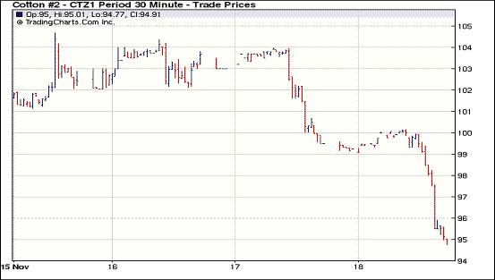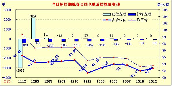 11月18日因技術(shù)層面不利及外部商品市場(chǎng)下跌影響,紐約期棉繼續(xù)大跌,近期12月合約結(jié)算價(jià)94.81美分/磅,跌469點(diǎn),1203月合約跌93.27美分,跌321點(diǎn)。前一日主力3月合約跌停,因缺乏買盤介入,18日市場(chǎng)上半個(gè)交易日在97美分一線弱勢(shì)徘徊,交易中期試圖突破98美分未果,外部谷物等商品市場(chǎng)下跌,期棉后期跌勢(shì)加劇,全盤以大跌報(bào)收。經(jīng)濟(jì)層面喜憂參半,美國(guó)經(jīng)濟(jì)咨商局宣布10月份的領(lǐng)先經(jīng)濟(jì)指標(biāo)指數(shù)上漲0.9%,好于市場(chǎng)預(yù)期,并創(chuàng)造了2月份以來(lái)的最大增幅,預(yù)示著全球最大的經(jīng)濟(jì)體2012年的經(jīng)濟(jì)將繼續(xù)增長(zhǎng),而歐債危機(jī)暫未穩(wěn)定,德國(guó)外交部長(zhǎng)表示該國(guó)正在考慮除希臘之外的國(guó)家“有序違約”的可能性。有分析師指出,“除非歐洲消息讓人覺得有些穩(wěn)定下來(lái)的感覺,否則市場(chǎng)仍將持續(xù)波動(dòng)。”