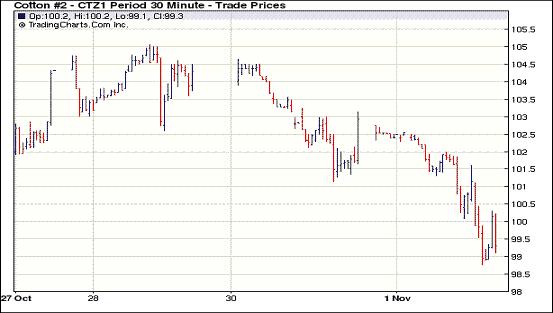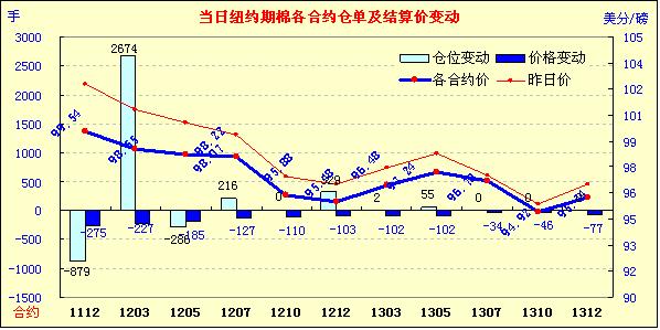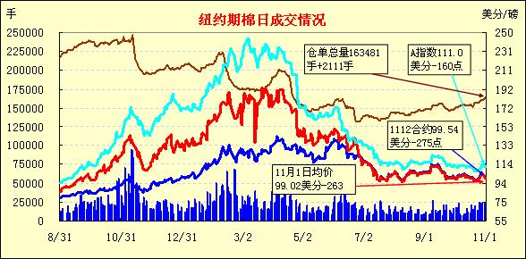 因美元走強(qiáng)及市場(chǎng)對(duì)經(jīng)濟(jì)層面的擔(dān)憂導(dǎo)致美國(guó)股市及外部大豆、原油市場(chǎng)走低,11月1日紐約期棉受拖累再度全面下跌,主力1112月合約結(jié)算價(jià)99.54美分/磅,跌275點(diǎn),1203月合約結(jié)算價(jià)98.55美分/磅,跌227點(diǎn);其他遠(yuǎn)期合約跌幅34-185點(diǎn)不等。當(dāng)日市場(chǎng)高開低走,主力1112月合約受歐洲債務(wù)危機(jī)憂慮影響,跌破9日以來(lái)的移動(dòng)平均線100.38美分/磅,當(dāng)日最低至98.77美分/磅(-352點(diǎn));尾盤時(shí)買盤介入,但市場(chǎng)反彈幅度有限,盤終該合約大幅告跌。外部市場(chǎng)漲跌不一,大豆及原油走低,小麥及玉米走高。希臘舉行全民公投的計(jì)劃引發(fā)了市場(chǎng)對(duì)歐元區(qū)救助方案可能落空的擔(dān)憂,導(dǎo)致美國(guó)股市昨日連續(xù)第二個(gè)交易日走低,歐洲股市遭遇拋售,期棉與其他市場(chǎng)共同承壓,近期能否再次上揚(yáng)還需關(guān)注經(jīng)濟(jì)層面的進(jìn)一步發(fā)展。