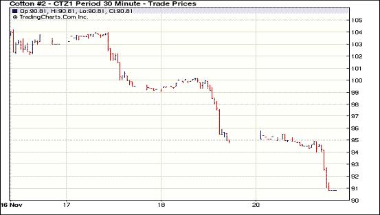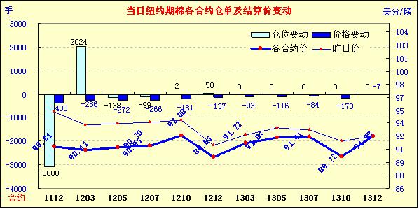 11月21日受歐美債務(wù)問題的擔(dān)憂拖累,美元走高,紐約期棉跟隨歐美股市及外部商品市場全線走低的態(tài)勢大幅收跌,近期1112月合約結(jié)算價(jià)90.81美分/磅,跌400點(diǎn),主力1203月合約結(jié)算價(jià)90.41美分/磅,跌286點(diǎn)。當(dāng)日市場小幅高開,主力1203月合約當(dāng)日最高至93.44美分/磅(+17點(diǎn));后市場對(duì)歐美經(jīng)濟(jì)的擔(dān)憂導(dǎo)致賣盤涌入,期棉承壓走低;尾盤時(shí)外部商品市場大幅走低拖累期棉跌幅加深,盤終主力合約收于2010年12月22日以來最低點(diǎn),其他合約也均大幅收跌。市場擔(dān)心意大利和西班牙借貸成本居高不下或推升歐元區(qū)信貸緊縮風(fēng)險(xiǎn),美國國會(huì)特別委員會(huì)無法在最后期限前達(dá)成預(yù)算赤字削減協(xié)議也令市場承壓,期棉和其他廣泛交易的大宗商品同步走低。