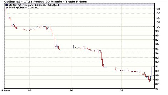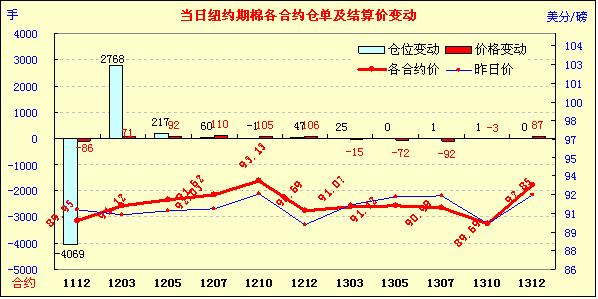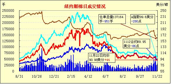 11月22日受美國GDP數據及歐債發(fā)展進程影響,紐約期棉漲跌不一,近期1112月合約結算價89.95美分/磅,跌86點,主力1203月合約結算價91.12美分/磅,漲71點。當日市場早盤小幅高開,后美國GDP數據利空及歐洲擔憂拖累期棉震蕩走低,主力1203月合約當日最低至89.33美分/磅(-108點);尾盤時經濟層面的利好消息給市場帶來提振,該合約受支持反彈,盤終結束前三個交易日的跌勢中幅收漲。當日外部谷物及油料市場全面告漲。第三季度美國GDP增速被向下修正至2.0%,初值為增長2.5%,此消息對市場形成打壓;國際貨幣基金組織計劃推出新的貸款安排,向陷入困境的歐洲國家提供新的資金,有利于在一定程度上緩解歐元區(qū)壓力,對市場產生刺激作用。