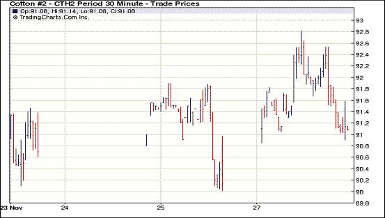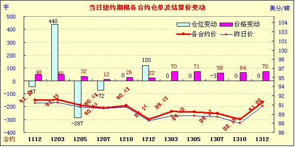 11月28日,受歐債危機(jī)緩解措施提振,美元走低、歐美股市及外部大宗商品市場(chǎng)全線上揚(yáng),紐約期棉同樣受助全面收漲,主力1203月合約結(jié)算價(jià)91.35美分/磅,漲48點(diǎn)。當(dāng)日市場(chǎng)早盤(pán)震蕩走低,后股市及大宗商品市場(chǎng)走高推動(dòng)期棉上漲,主力1203月合約至當(dāng)日最高點(diǎn)92.81美分/磅(+194點(diǎn));午盤(pán)后買(mǎi)盤(pán)撤退致期棉承壓下跌,該合約最低至90.85美分/磅,震蕩幅度196點(diǎn);尾盤(pán)時(shí)買(mǎi)盤(pán)再次介入,盤(pán)終該合約中幅告漲,其他合約漲幅12-71點(diǎn)不等。有消息稱(chēng),歐元區(qū)領(lǐng)導(dǎo)人計(jì)劃制定新協(xié)議來(lái)抑制主權(quán)債務(wù)危機(jī),該協(xié)議的措施包括通過(guò)賦予預(yù)算紀(jì)律法律約束力來(lái)削減巨額債務(wù),投資者對(duì)這一措施頗感樂(lè)觀,刺激歐美股市及大宗商品市場(chǎng)上漲。