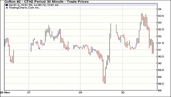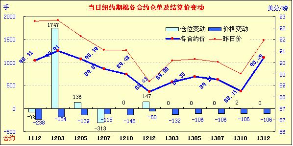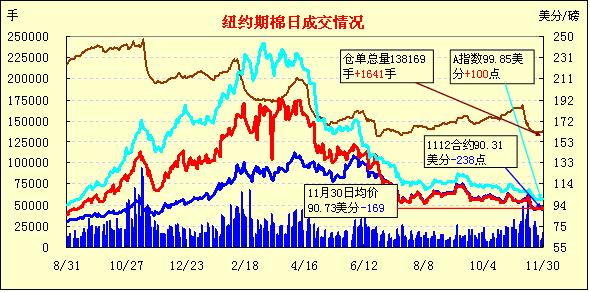 11月30日,雖然美元指數(shù)下跌刺激美國(guó)股市及外部大宗商品市場(chǎng)全線上漲,但受歐債危機(jī)前景尚不確定及賣盤打壓,紐約期月棉全面下跌,主力1203月合約結(jié)算價(jià)90.91美分/磅,跌184點(diǎn),其他合約跌幅60-238點(diǎn)不等。當(dāng)日市場(chǎng)平穩(wěn)開盤,主力1203月在賣盤打壓下行至當(dāng)日最低點(diǎn)90.70美分/磅(-205點(diǎn));午盤后股市及外部商品市場(chǎng)走高帶動(dòng)期棉上漲,該合約最高至93.67美分/磅,震蕩幅度高達(dá)297點(diǎn);尾盤時(shí)賣盤涌入導(dǎo)致該合約回吐全部漲幅并大幅告跌,其他合約也普遍大幅收跌。美國(guó)聯(lián)邦儲(chǔ)備委員會(huì)和歐洲央行在內(nèi)的主要央行同意降低緊急美元貸款的借貸成本,美元受此影響全線下跌,道瓊斯工業(yè)股票平均價(jià)格指數(shù)創(chuàng)下自2009年3月份以來(lái)最大的單日漲幅,外部大宗商品市場(chǎng)也全線收漲,但受歐債危機(jī)前景不確定性影響,紐約期棉大幅收跌,投資者期待美棉出口周報(bào)指引。