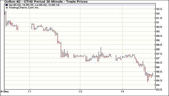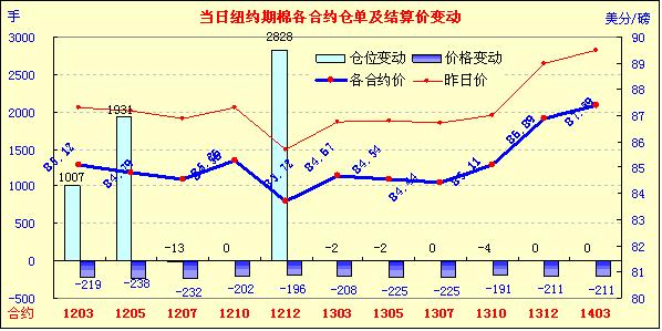 12月14日,歐債危機持續(xù)不消推動美元走高,歐美股市及外部大宗商品市場大幅走低,紐約期棉受拖累全面收跌,主力1203月合約結(jié)算價85.12美分/磅,跌219點,1205月合約結(jié)算價84.79美分/磅,跌238點,其他遠期合約跌幅191-232點不等。當日市場平穩(wěn)開盤,后股市及外部商品市場走低拖拽期棉持續(xù)下跌,主力1203月合約跌破85.00美分/磅,至當日最低點84.35美分/磅;尾盤時在少量買盤支撐下回補部分漲幅,盤終該合約收跌200余點,過去5個交易日累計跌幅719點。昨日歐元跌破1.30美元的重要心理關(guān)口,這反映出市場對歐債危機持續(xù)不消可能引發(fā)歐洲經(jīng)濟陷入全面衰退的擔憂,進而推高美元至11個月以來高點,商品市場承壓全面走低,原油期貨當日跌幅超過5%,為三個月來最大單日跌幅。