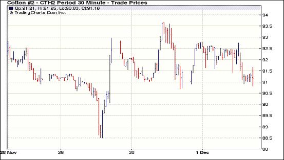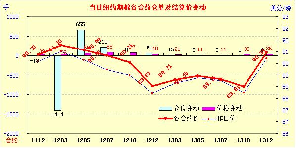 12月1日,因投資者對(duì)歐債危機(jī)不斷惡化的擔(dān)憂情緒有所緩解,紐約期棉全面告漲,主力1203月合約結(jié)算價(jià)91.30美分/磅,漲39點(diǎn),其他合約漲幅11-85點(diǎn)不等。當(dāng)日市場(chǎng)早盤震蕩走低,主力1203月合約至當(dāng)日最低點(diǎn)90.83美分/磅(-8點(diǎn));午盤后市場(chǎng)對(duì)歐債危機(jī)擔(dān)憂減弱促期棉上漲,該合約最高至92.77美分/磅,震蕩幅度高達(dá)194點(diǎn);尾盤時(shí)美股及多數(shù)外部商品市場(chǎng)下跌導(dǎo)致該合約回吐部分漲幅,盤終小幅告漲。當(dāng)日外部市場(chǎng)漲跌不一,大豆、小麥、原油期貨走低,玉米期貨走高。西班牙周四拍賣了37.5億歐元的國(guó)債,將該國(guó)10年期國(guó)債收益率壓至兩周低位;法國(guó)也成功拍賣了44億歐元國(guó)債,發(fā)債成本相對(duì)較低,這個(gè)消息暫時(shí)平息了國(guó)債市場(chǎng)的緊張情緒,對(duì)期棉也產(chǎn)生利好作用。11.18-11.24一周美國(guó)凈簽約出口本年度陸地棉19278噸,較之前三周明顯減少,對(duì)市場(chǎng)影響不大。
