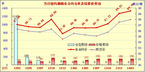 12月19日,在外部商品市場(chǎng)全面走高及少量買(mǎi)盤(pán)支撐下,紐約期棉普遍大幅收漲,主力1203月合約結(jié)算87.09美分/磅,漲80點(diǎn),1205月合約結(jié)算價(jià)86.72美分/磅,漲79點(diǎn),其他遠(yuǎn)期合約漲幅82-172點(diǎn)不等。投資者在假日來(lái)臨之際普遍持觀望態(tài)度,市場(chǎng)成交清淡。當(dāng)日期棉早盤(pán)在中國(guó)市場(chǎng)植棉面積或減少消息推動(dòng)下走高,主力1203月合約至當(dāng)日最高點(diǎn)87.50美分/磅;后有關(guān)歐洲經(jīng)濟(jì)的悲觀消息打壓市場(chǎng)人氣,該合約承壓走低至85.90美分/磅,震蕩幅度160點(diǎn);午盤(pán)后外部商品市場(chǎng)普遍走高帶動(dòng)期棉反彈,盤(pán)終該合約大幅上漲。雖然昨日大宗商品市場(chǎng)普遍上揚(yáng),但經(jīng)濟(jì)層面仍不容樂(lè)觀。據(jù)歐洲央行半年度《金融穩(wěn)定報(bào)告》顯示,歐元區(qū)今年下半年穩(wěn)定性風(fēng)險(xiǎn)已上升至2008年金融危機(jī)爆發(fā)以來(lái)的最嚴(yán)重水平。歐洲央行行長(zhǎng)德拉吉昨日稱(chēng)歐洲經(jīng)濟(jì)將于明年年初陷入衰退,此消息導(dǎo)致市場(chǎng)人氣下降,預(yù)計(jì)商品市場(chǎng)漲勢(shì)難以持續(xù),投資者繼續(xù)關(guān)注歐洲態(tài)勢(shì)的發(fā)展。