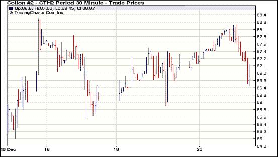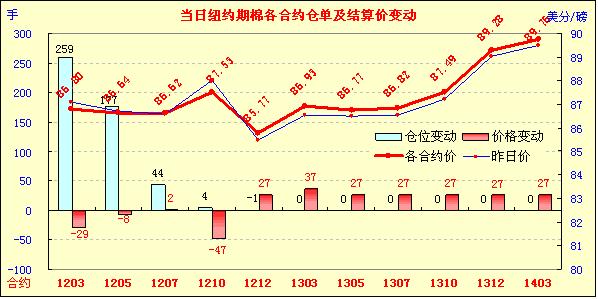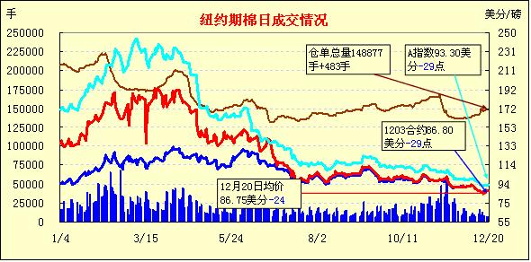 12月20日,受美國經(jīng)濟數(shù)據(jù)表現(xiàn)強勁和西班牙國債拍賣取得成功推動,美元走低,歐美股市及外部大宗商品市場全線上揚,但紐約期棉獲支撐有限近跌遠漲,主力1203月合約結算86.80美分/磅,跌29點,1205月合約結算價86.64美分/磅,跌8點。因圣誕節(jié)假期即將來臨,投資者普遍駐足觀望,市場成交清淡。當日期棉早盤在外圍商品市場走高帶動下上漲,主力1203月合約至當日最高點88.14美分/磅;午盤后買盤支撐不足,該合約走低至86.45美分/磅,震蕩幅度169點;尾盤時該合約回補部分跌幅,盤終小幅收跌。因美國新屋開工數(shù)升至近兩年來最高水平,西班牙國債拍賣取得成功也推動投資者人氣升溫,但歐債危機缺乏解決方案仍令期棉承壓,預計壓力還將繼續(xù),期棉短期內(nèi)以弱勢震蕩為主。