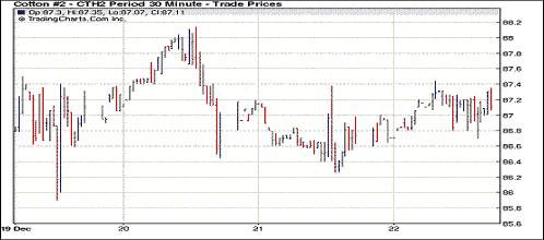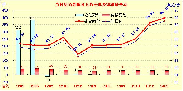 12月22日,因美國經(jīng)濟數(shù)據(jù)樂觀,美指下跌、外部大宗商品市場全線走高,紐約期棉受提振同樣上漲,主力1203月合約結(jié)算87.24美分/磅,漲40點,1205月合約結(jié)算價87.08美分/磅,漲42點,其他遠期合約漲幅26-38點不等。假日臨近,市場交投淡靜,成交持續(xù)在低位徘徊。當日市場早盤震蕩走高,主力1203月合約超過前一日高點,上行至87.44美分/磅;后因歐洲央行的舉措導(dǎo)致市場對流動性擔(dān)憂重燃及美國經(jīng)濟數(shù)據(jù)利好,市場多空消息交錯,該合約震蕩頻度較大,最低至86.60美分/磅;尾盤時買盤涌入促市場反彈,盤終該合約小幅告漲。當日外部谷物及油料市場也普遍上漲。美國勞工部昨日宣布,截止12月17日當周首次申請失業(yè)人數(shù)減少至364,000人,為2008年4月份以來最低水平;美國世界大型企業(yè)研究會公布的11月份領(lǐng)先指標連續(xù)第七個月上升;消費者信心指數(shù)同樣上升,升幅超過預(yù)期。這一系列美國經(jīng)濟數(shù)據(jù)加強了市場對全球經(jīng)濟增長的希望,股市及大宗商品市場受支撐全面走高。