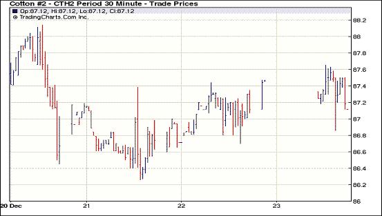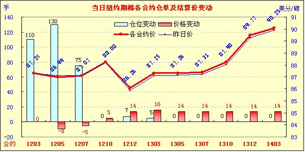 12月23日,受圣誕節(jié)假期影響,紐約期棉橫盤弱勢震蕩,主力1203月合約結(jié)算價87.24美分/磅,不變,1205月合約結(jié)算價86.99美分/磅,跌9點,其他合約普遍微幅收漲。投資者普遍進入休假期,市場成交極為清淡。市場開盤震蕩走低,主力1203月合約最低至86.86美分/磅;后因美國股市走高及外圍商品市場提振,該合約上行至當日最高點87.65美分/磅,震蕩幅度79點;尾盤時買盤獲利了結(jié)回吐部分漲幅,盤中該合約與前一日持平。當日外圍谷物及油料市場普遍持穩(wěn)并微幅收漲。因棉花基本面消費疲軟,且投資者在節(jié)前結(jié)清頭寸休假,市場成交持續(xù)平淡,預(yù)計棉價元旦前難以擺脫弱勢,將延續(xù)低位橫盤格局 。外圍市場方面,道瓊斯工業(yè)股票平均價格指數(shù)漲至五個月高點,投資者因美國經(jīng)濟增長加速以及國會在薪資稅減稅問題上打破僵局而受到鼓舞,美國股市周五收盤連續(xù)第四個交易日上揚。因12月26日(下周一)是圣誕節(jié)假期,紐約期棉休市一天。