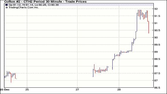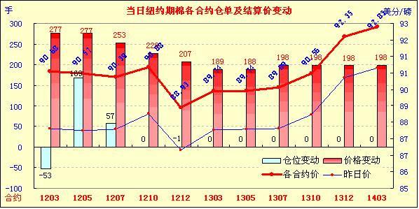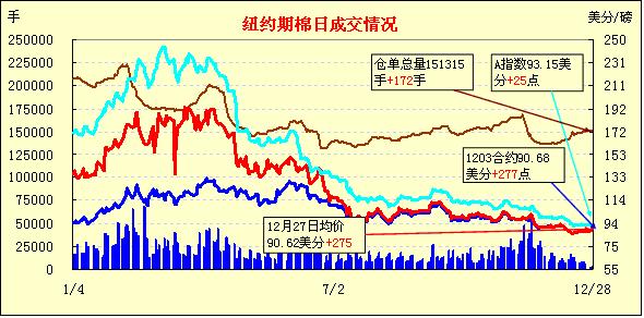 12月28日,雖然意大利長(zhǎng)期國債拍賣引發(fā)市場(chǎng)擔(dān)憂,美指走高、美股整體走低,但紐約期棉在技術(shù)買盤支撐下全面上揚(yáng),主力1203月合約結(jié)算價(jià)90.68美分/磅,漲277點(diǎn),1205月合約結(jié)算價(jià)90.57美分/磅,漲277點(diǎn),其他遠(yuǎn)期合約漲幅188-253點(diǎn)不等。市場(chǎng)一改前一周的低迷態(tài)勢(shì),成交量大幅增加。當(dāng)日市場(chǎng)小幅高開,主力1203月合約圍繞89.00美分/磅窄幅震蕩;后技術(shù)買盤涌入,該合約受支撐上行至漲停(91.91美分/磅);尾盤時(shí)買盤獲利了結(jié)回吐部分漲幅,盤終該合約大幅告漲。當(dāng)日外部市場(chǎng)漲跌不一,玉米機(jī)小麥期貨走高,大豆及原油期貨走低。昨日歐元跌至11個(gè)月低點(diǎn),這令市場(chǎng)關(guān)注焦點(diǎn)再度回到面臨困境的歐洲金融體系上。投資者對(duì)意大利周四的長(zhǎng)期國債拍賣憂心忡忡,導(dǎo)致美股整體走低,期棉雖在技術(shù)買盤支撐下走高,但由于經(jīng)濟(jì)層面利空及消費(fèi)面持續(xù)不能得到改善,預(yù)計(jì)漲勢(shì)難以繼續(xù)。