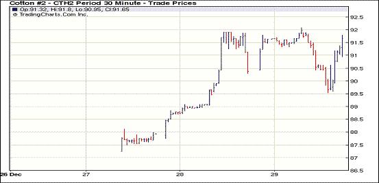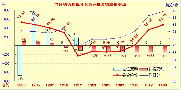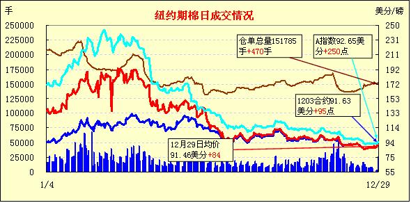 12月29日,美國經(jīng)濟(jì)數(shù)據(jù)略有改善推動美股走高,意大利國債拍賣平平引發(fā)市場擔(dān)憂重燃,紐約期棉前三份合約收漲,主力1203月合約結(jié)算價91.63美分/磅,漲95點(diǎn),1205月合約結(jié)算價91.36美分/磅,漲79點(diǎn),遠(yuǎn)期合約普遍中幅或大幅收跌。當(dāng)日市場開盤后窄幅震蕩,美國經(jīng)濟(jì)數(shù)據(jù)利好促使買盤涌入,主力1203月合約受支撐上行至92.09美分/磅(+141點(diǎn));后歐洲消息不佳打壓市場回落,該合約跌至89.53美分/磅,震蕩幅度256點(diǎn);尾盤時回補(bǔ)部分跌幅,盤終該合約大幅告漲。當(dāng)日外部市場漲跌不一,大豆、玉米及小麥期貨走低,原油期貨上揚(yáng)。29日市場消息多空交織,最新公布的數(shù)據(jù)顯示,美國截至12月24日當(dāng)周首次申請失業(yè)救濟(jì)人數(shù)連續(xù)第四周保持在400,000人的關(guān)口下方,11月份成屋簽約銷量升至19個月來的最高水平,這給市場帶來提振;意大利年內(nèi)最后一次國債拍賣的結(jié)果令投資者失望,歐元兌美元跌至2010年9月份以來的最低水平,導(dǎo)致圍繞歐元區(qū)債務(wù)問題正在惡化的擔(dān)憂再度重燃。