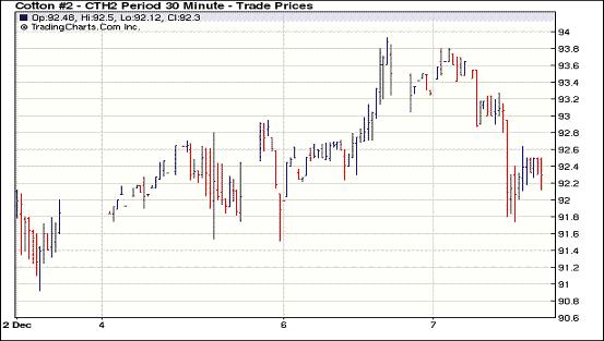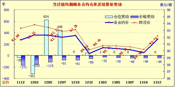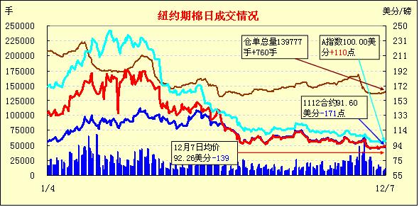 12月7日,因圍繞歐元區(qū)債務問題的悲觀情緒重燃,紐約期棉缺乏買盤支撐全面收跌,主力1203月合約結(jié)算價92.31美分/磅,跌150點。投資者仍普遍持觀望態(tài)度,成交量不足一萬手。當日市場開盤后短暫走高,主力1203月合約至當日最高點93.80美分/磅(+1點);后受歐債危機憂慮及外部商品市場普遍走低拖累,該合約震蕩下行,最低至91.75美分/磅,震蕩幅度達205點;尾盤時反彈回補部分跌幅,盤終該合約大幅收跌,其他合約跌幅32-171點不等。當日外部小麥、大豆及原油市場走低,大豆市場走高。定于周四和周五舉行的歐盟峰會能否達成期待中的主權債務問題解決方案,外界也廣泛引述德國一位高級官員的話稱,德國政府不認為歐元區(qū)成員國已準備好采取必要措施來解決債務危機,這番言論加重了市場的擔憂情緒,導致商品市場普遍走低。美國農(nóng)業(yè)部(USDA)將于今日公布最新的美棉出口情況,市場期待其給出指引方向。