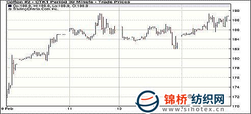 2月15日,紐約期棉扭轉(zhuǎn)周一跌勢,雖然外圍商品大多下跌,但期棉依然高開高走,盤終大幅收漲,5月主力合約漲487點收于187.93美分/磅。當(dāng)日期棉小幅高開,雖然外圍豆類和小麥期貨大幅走弱,玉米也承壓回落,但投機(jī)資金和商業(yè)買盤推動期棉持續(xù)穩(wěn)步攀升,近期3月合約盤中突破前日高點191.60美分,最高沖到191.75美分,主力5月合約大幅走高,盤終收于該合約的歷史高點187.93美分,新花各合約也有所上漲,但漲幅相對較小。澳棉減產(chǎn)和鄭棉走勢強勁也給紐約期棉一定支撐。澳大利亞政府預(yù)估澳棉產(chǎn)量為83.9萬噸,低于年前12月份的預(yù)期(89.4萬噸)。 紐約期棉近期1105合約近三個交易日交易走勢 紐約棉評:期棉收漲 受逢低承接推動