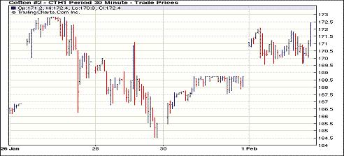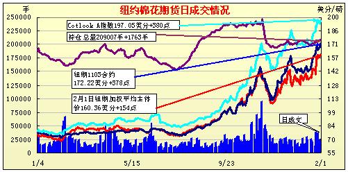 2月1日,美元指數(shù)繼續(xù)趨弱,利好大宗商品,大宗谷物市場大多保持揚升態(tài)勢,紐約期棉再度迫近前期高位,其中近期3月合約漲378點收于172.22美分/磅,再創(chuàng)歷史高點。當日期棉大幅高開,中國鄭州棉花期貨春節(jié)前最后一個交易日突破前高,利好期棉保持升勢,同時據(jù)傳印度原定于2月10日的棉花會議暫定取消,因此估計暫無可能擴大棉花出口配額,而美元大幅走弱,推動大宗商品走強,紐約期棉順勢再度大幅上漲,雖然盤中高位震蕩,但盤終各合約繼續(xù)收高,部分合約已經(jīng)突破前期高位,技術面漲勢延續(xù)。 紐約棉花期貨近期1103合約近三個交易日交易走勢 |