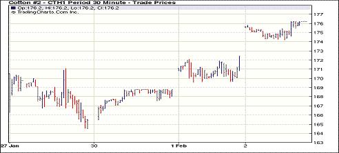 2月2日,美元指數(shù)走弱,小麥瘋漲,助推紐約期棉漲停,其中近期3月合約漲400點(diǎn)收于176.22美分/磅,12月合約漲214點(diǎn)收于118.37美分/磅。當(dāng)日紐約期棉跳空高開,繼續(xù)大幅上揚(yáng);市場(chǎng)風(fēng)險(xiǎn)性偏好上升,美元指數(shù)繼續(xù)走弱;另外超強(qiáng)的熱帶“雅思”颶風(fēng)3日凌晨從澳大利亞東北部地區(qū)登陸,擾亂國際農(nóng)產(chǎn)品市場(chǎng),CBOT小麥大幅上揚(yáng);另外市場(chǎng)對(duì)于美國的作物種植依然充滿幻想,諸多利好刺激紐約期棉收于高位。 紐約期棉近期1103合約近三個(gè)交易日交易走勢(shì) |