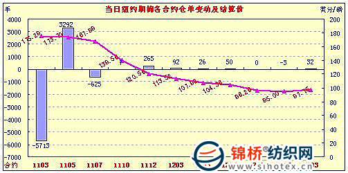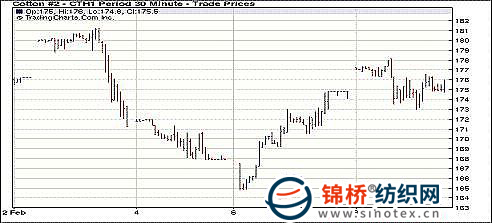 2月8日,在USDA最新全球棉花供需報(bào)告之前,紐約期棉震蕩揚(yáng)升,盤中由于中國再度加息致使期棉急速回落,盤終除3月近期合約小幅收漲,其它合約繼續(xù)大幅上漲。當(dāng)日期棉小幅高開,外圍商品普通走強(qiáng),期棉繼續(xù)沖高,3月合約最高上漲365點(diǎn)到178.16美分/磅,但中國于春節(jié)結(jié)束之際再度加息令市場(chǎng)承壓,期棉快速回落,期棉3月合約下探至172.94美分/磅,但紡企買盤提振期棉,同時(shí)3月期權(quán)馬上到期,展期交投活躍均活躍交易,并令期棉回升。期棉3月和5月價(jià)差從周一的369點(diǎn)大幅縮窄至159點(diǎn)。 紐約期棉近期1103合約近三個(gè)交易日交易走勢(shì) |