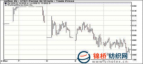 受外部商品市場(chǎng)下跌影響,3月10日紐約期棉市場(chǎng)近期5月合約和1107月合約下跌300余點(diǎn),5月合約結(jié)算價(jià)200.98美分/磅,遠(yuǎn)期12月合約保持漲勢(shì),結(jié)算價(jià)128.80美分/磅,漲220點(diǎn)。當(dāng)日貿(mào)易買盤給予市場(chǎng)支持,5月合約早盤穩(wěn)定走高,最高達(dá)到207.71美分(+172點(diǎn)),盤中震蕩,交易后期美國(guó)經(jīng)濟(jì)數(shù)據(jù)令人失望,中東與北非政局持續(xù)動(dòng)蕩,歐洲主權(quán)債務(wù)危機(jī)再度引起憂慮,迫使美國(guó)股市和商品市場(chǎng)均出現(xiàn)下滑,美元匯率走強(qiáng),期棉難以獨(dú)善其身,尾盤出現(xiàn)下滑,最終收于近低點(diǎn)。遠(yuǎn)期12月合約受美棉出口周報(bào)利好保持漲勢(shì)。USDA(美國(guó)農(nóng)業(yè)部)全球棉花供需預(yù)測(cè)月報(bào)出臺(tái),全球棉花消費(fèi)和期末庫(kù)存數(shù)據(jù)調(diào)整變化不大,期棉市場(chǎng)反應(yīng)平淡;美棉出口周報(bào)顯示上周美國(guó)凈簽約出口下年度陸地棉89380噸,對(duì)遠(yuǎn)期合約形成支持。 紐約期棉近期1105合約近三個(gè)交易日交易走勢(shì) 紐約棉評(píng):盡管供需報(bào)告利多 棉花期貨仍收低