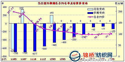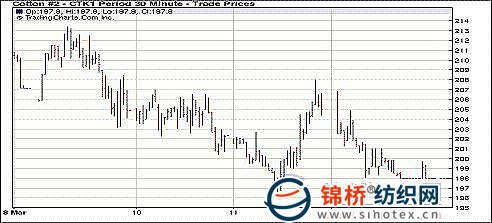 3月14日,紐約期棉市場全面下跌,近期5月合約跌停,結(jié)算價197.94美分/磅,1112月合約跌555點,收于122.77美分/磅。投機資金撤離,是導(dǎo)致市場下跌的主要原因。當日5月合約延續(xù)上周五的漲勢高開。但當5月合約早盤最高漲至206.83美分(+189點)后上漲動能不足,日本地震引發(fā)了業(yè)內(nèi)對全球經(jīng)濟及金融市場的不確定性,促使投機資金從商品市場出逃以規(guī)避風險,棉花期貨市場受到壓制盤中越走越低,5月合約封于跌停板,新棉12月合約仍處弱勢。 紐約期棉近期1105合約近三個交易日交易走勢 |
