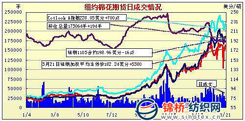 3月21日,紐約期棉市場多漲少跌,日內(nèi)波幅較大,近期5月合約最高價204.88美分/磅,最低價197.35美分,結(jié)算價198.96,跌16點;1112月合約結(jié)算價124.37美分,漲53點。當日市場開盤在炒作基本面短期供應緊張概念走高,5月合約輕松突破200美分,同時開盤的中國電子盤早盤走高也給紐約期棉支持,但市場在高位遭遇技術(shù)性賣盤及獲利了結(jié)盤打壓回落,盤中雖現(xiàn)反攻勢頭,但盤尾5月合約仍跌破200美分,微幅收跌。