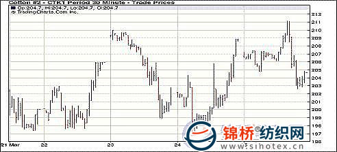 3月25日紐約期棉市場(chǎng)近跌遠(yuǎn)穩(wěn),近期5月合約收于204.49美分/磅,跌433點(diǎn),1112月合約127.92美分,漲11點(diǎn)。資金出逃與基本面因素博弈,對(duì) 期棉近期合約予以打擊。當(dāng)日5月合約小幅低開(kāi),上半場(chǎng)在205美分上下窄幅波動(dòng);美國(guó)農(nóng)業(yè)部發(fā)布的棉花加工數(shù)據(jù)顯示,2010/11年度美國(guó)總計(jì)加工出皮棉394.08萬(wàn)噸,相比此前預(yù)期低出4.7萬(wàn)噸,此消息發(fā)布后激起期棉市場(chǎng)漲勢(shì),5月合約最高達(dá)到211.16美分的歷史最高水平;交易后期,受技術(shù)性賣(mài)盤(pán)和獲利了結(jié)壓力,期棉高位下滑,5月合約吐盡前一日漲幅下跌收盤(pán),12月合約收平。