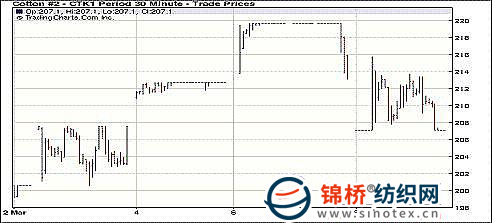 3月8日紐約期棉市場全面下跌,主力5月和1107月合約跌停,1112月合約120.75美分/磅,跌578點。當日市場低開低走,早盤5月合約跌停。后在投機買盤和貿(mào)易買盤支持下觸底反彈,5月合約最高達到215.75美分,盤中高位震蕩,交易后期,由于外部谷物、油料和原油期貨全面下跌,投機商清算多頭,期棉從高位下滑,5月合約封于跌停。 紐約期棉近期1105合約近三個交易日交易走勢 紐約棉評:投資者結(jié)清頭寸 期棉收低