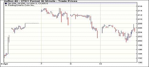 4月11日紐約期棉中幅上揚(yáng),多數(shù)合約漲幅超過百點(diǎn)。 由于指數(shù)基金持倉遠(yuǎn)移,昨日市場開盤后近期5月合約一路下跌,至當(dāng)日最低點(diǎn)199.35美分/磅;后出現(xiàn)部分買盤支撐使價格反彈。盤終5月合約收于204.58美分/磅,漲161點(diǎn);7月合約收于190.91美分/磅,漲101點(diǎn)。4月25日(周一)為5月合約第一交割通知日。