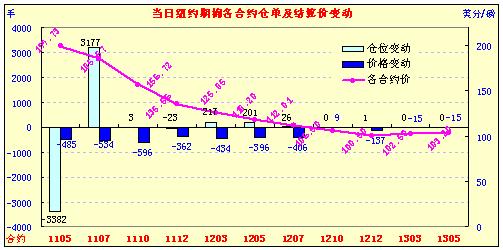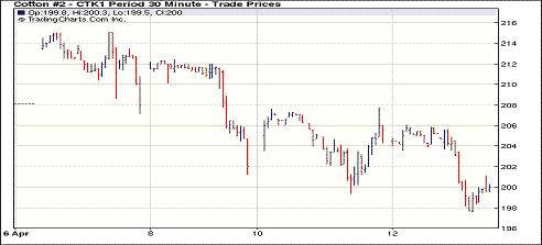 4月12日紐約期棉受到拋盤打壓,大幅下滑,近期合約跌幅均在500點左右;當(dāng)日成交量仍在3萬手以上。當(dāng)日市場早盤高開,成交清淡,盤中大量賣盤涌現(xiàn),打壓棉價走低,5月合約至203美分/磅時觸發(fā)止損賣盤,最低至197.60美分/磅。后低位出現(xiàn)部分買盤,價格小幅反彈。盤中5月合約收于199.73美分/磅,跌485點;7月合約收于185.57美分/磅,跌534點;遠期合約跌幅相對較小。某大型投資公司建議不要再投資商品期貨,因價格已超出預(yù)期目標(biāo),因此出現(xiàn)大量拋盤,造成市場下跌。除棉花以外,原油、谷物等期貨市場等也紛紛走弱。 紐約期棉近期1105合約近三個交易日交易走勢