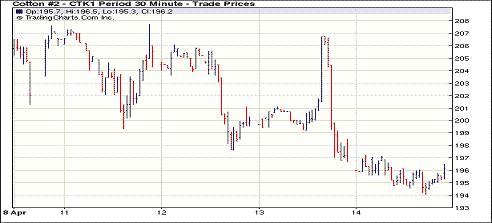 4月14日紐約期棉延續(xù)前一日跌勢,受外圍市場及基本面影響,近期合約中幅下跌,遠期合約小幅上漲。當日市場開盤后始終保持低位震蕩,近期5月合約受到賣盤打壓最低至194.06美分/磅,7月合約最低至176.93美分/磅,后少量低位買盤介入,價格略有反彈,盤終5月合約收于196.04美分/磅,跌131點;7月合約收于178.00美分/磅,跌264點。昨日美棉出口周報利空,上周本年度陸地棉凈簽約為負的2.2萬噸,其中中國凈簽約為負的1.3萬噸。此外美國股市及商品市場走弱對棉市造成拖拽。