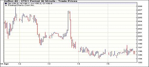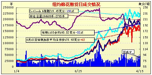 4月15日紐約期棉再度收陰,各合約全面下跌,其中遠(yuǎn)期合約跌幅較大,成交量有所萎縮。從4月12日至15日,期棉近期合約已連續(xù)4個(gè)交易日收跌。當(dāng)日市場(chǎng)小幅高開,主力7月合約圍繞178美分/磅附近反復(fù)震蕩,最高至179.95美分/磅,最低為176.46美分/磅,盤終前兩個(gè)合約微幅收跌,5月合約收于195.52美分/磅,跌52點(diǎn);7月合約收于177.40美分/磅,跌60點(diǎn)。其他遠(yuǎn)期合約跌幅較大,普遍在200點(diǎn)以上。因高盛公司預(yù)期未來幾個(gè)月棉花市場(chǎng)走弱,同時(shí)他們有部分多頭持倉平倉,因此對(duì)期棉市場(chǎng)造成打壓,特別是對(duì)遠(yuǎn)期合約。