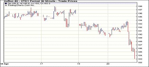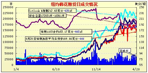 4月20日紐約期棉多數(shù)合約下跌,近期5月合約接近跌停板,收于3月中旬以來最低點(diǎn)。當(dāng)日市場(chǎng)低開,早盤一度大幅上揚(yáng),5月合約最高至193.75美分/磅。后半場(chǎng)有大量賣盤涌現(xiàn),棉價(jià)快速回落,5月合約最低至183.02美分/磅,接近跌停板,較當(dāng)日最高點(diǎn)下跌1073點(diǎn)。盤終前兩個(gè)合約大幅收跌,5月合約收于183.17美分/磅,跌665點(diǎn),為3月16日(185.12美分/磅)以來最低點(diǎn);7月合約收于167.06美分/磅,跌410點(diǎn);其它遠(yuǎn)期合約普遍微幅收跌。