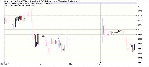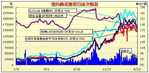 4月25日紐約期棉因基本面壓力成交清淡,主力7月合約中幅收跌。當日紐約期棉主力7月合約早盤走高,最高至172.44美分/磅;但隨著賣盤涌入市場,該合約很快回落,最低至165.22美分/磅,且收于低位。其它合約受到少量買盤支撐,普遍中幅上揚。盤終5月合約收于188.08美分/磅,漲141點;7月合約收于166.39美分/磅,跌112點。當日主力合約受到打壓主要因基本面利空,包括美棉出口簽約取消、南半球新上市棉花價格較低。