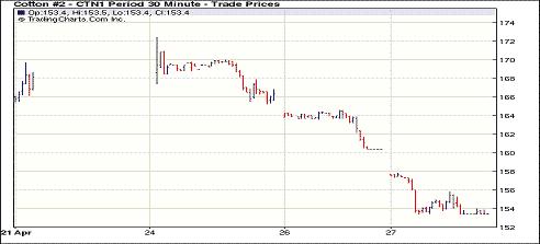 4月27日紐約期棉延續(xù)前一日跌勢(shì),主力合約遭賣盤打壓再度收于跌停板,連續(xù)三個(gè)交易日累計(jì)跌幅達(dá)1412點(diǎn)。當(dāng)日市場(chǎng)低開低走,主力7月合約多數(shù)時(shí)間處于低位震蕩。由于中國(guó)市場(chǎng)走弱加之外圍谷物等期貨價(jià)格下跌,期棉市場(chǎng)出現(xiàn)大量空頭平倉(cāng),導(dǎo)致當(dāng)日合約全面下跌。盤終近期5月合約收于174.89美分/磅,跌695點(diǎn);7月合約收于153.39美分/磅,跌700點(diǎn);遠(yuǎn)期合約相對(duì)跌幅較小。