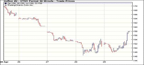 4月29日紐約期棉受到貿(mào)易買(mǎi)盤(pán)支撐及外圍市場(chǎng)提振尾市大幅反彈,主力合約收于600點(diǎn)漲停板。當(dāng)日市場(chǎng)先抑后揚(yáng),主力7月合約開(kāi)盤(pán)后走弱,最低至147.80美分/磅,隨后有大量來(lái)自紡織廠的買(mǎi)盤(pán)涌入市場(chǎng),促價(jià)格反彈且快速?zèng)_高,尾盤(pán)時(shí)達(dá)到漲停板。盤(pán)終近期5月合約收于178.78美分/磅,漲596點(diǎn);7月合約收于158.02美分/磅,漲600點(diǎn)。當(dāng)日美元下挫,外圍商品期貨市場(chǎng)普遍上揚(yáng)。