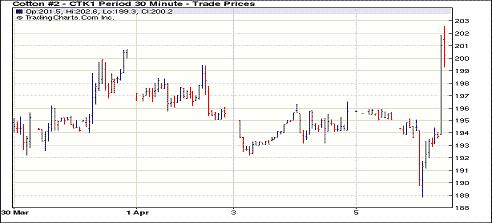 4月5日紐約期棉交投活躍,受到貿(mào)易買盤支持近期合約強(qiáng)勢反彈,大幅收漲。當(dāng)日棉市早盤走弱,根據(jù)報(bào)告5月合約跌至192美分/磅以下時(shí)觸發(fā)止損賣盤,導(dǎo)致價(jià)格進(jìn)一步下挫,直至188.85美分/磅;后低位貿(mào)易買盤涌入市場,助價(jià)格大幅反彈,最終重回200美分一線之上。盤終5月合約收于201.06美分/磅,漲551點(diǎn);7月合約收于191.39美分/磅,漲412點(diǎn);遠(yuǎn)期合約普遍小幅收跌。