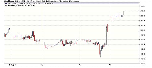 4月6日紐約期棉受到買盤支撐全面上揚(yáng),1105月合約收于漲停板,為該合約歷史最高點(diǎn)。當(dāng)日市場平開高走,1105及1107月合約盤中均觸及漲停板,后有部分賣盤涌現(xiàn),7月合約打開漲停板,有所回落。最終5月合約收于208.06美分/磅,漲700點(diǎn);7月合約收于195.42美分/磅,漲403點(diǎn)。周五USDA供需預(yù)測公布之前中有部分空頭回補(bǔ)買盤對棉價(jià)形成支撐。盡管印度農(nóng)業(yè)部長呼吁增加棉花出口且業(yè)內(nèi)預(yù)測下年度印度棉花面積將增加10%,但期棉市場未受到影響。德州的旱情仍受到關(guān)注,至于是否會(huì)影響新花產(chǎn)量,還要看后期發(fā)展。 紐約期棉近期1105合約近三個(gè)交易日交易走勢