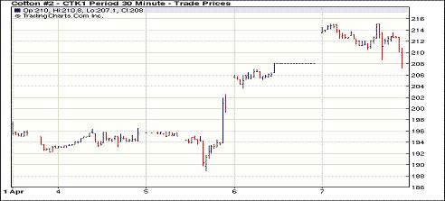 4月7日紐約期棉受指數(shù)基金平倉(cāng)、美棉出口周報(bào)顯示大量陸地棉簽約取消以及日本再次爆發(fā)地震等利空因素影響,多數(shù)合約收跌,近期5月合約微幅收漲。當(dāng)日市場(chǎng)早盤走高,5月合約觸漲停盤215.06美分/磅;后賣盤涌現(xiàn),價(jià)格回落,基本收回全部漲幅,盤終5月合約收于208.22美分/磅,漲16點(diǎn);7月合約收于194.57美分/磅,跌85點(diǎn);其它遠(yuǎn)期合約普遍收跌。