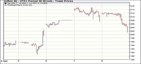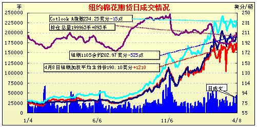 4月8日紐約期棉先漲后跌,雖美國(guó)農(nóng)業(yè)部(USDA)報(bào)告利好,但棉市遭到賣盤打壓,近期合約大幅收跌。當(dāng)日USDA預(yù)測(cè)中調(diào)減本年度全球棉花產(chǎn)量至2493.7萬噸,調(diào)增全球消費(fèi)至2550.1萬噸,期末庫(kù)存調(diào)減17萬噸,至904.7萬噸;受報(bào)告的利好支持,ICE期棉早盤走高,近期5月合約最高至212.40美分/磅。但買盤后續(xù)力量不足,賣盤開始涌現(xiàn),棉市遭到打壓,5月合約大幅回落,最低至201.25美分/磅,較最高點(diǎn)下跌1115點(diǎn)。盤終5月合約收于202.97美分/磅,跌525點(diǎn);7月合約收于189.90美分/磅,跌467點(diǎn);其它遠(yuǎn)期合約普遍微幅收漲。
