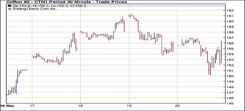 5月20日紐約期棉市場(chǎng)跌勢(shì)有所緩解,近期7月合約下跌4點(diǎn),結(jié)算價(jià)155.61美分/磅,1112月合約漲57點(diǎn),結(jié)算價(jià)119.76美分。市場(chǎng)微幅低開后平穩(wěn)走高,7月合約最高上漲至157.02美分(+137點(diǎn)),12月合約停留于120美分一線水平,盤中因美元走強(qiáng)和技術(shù)面壓力, 期棉掉頭向下,7月合約最低回落至150.06美分(-559點(diǎn)),12月合約重新回落至關(guān)鍵阻力位120美分以下。尾段有買盤介入,市場(chǎng)低點(diǎn)反彈,最終7月合約以下跌4點(diǎn)收平,其他多數(shù)合約小幅上漲。