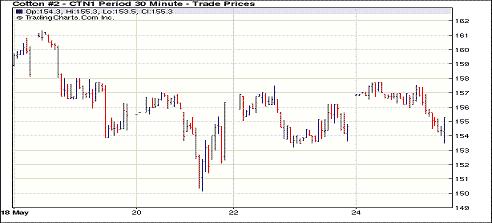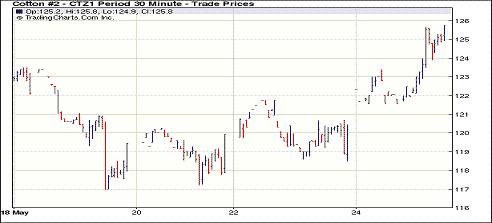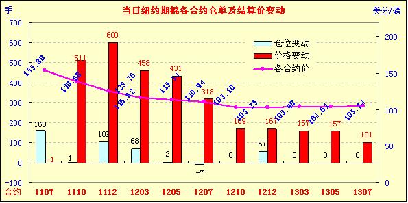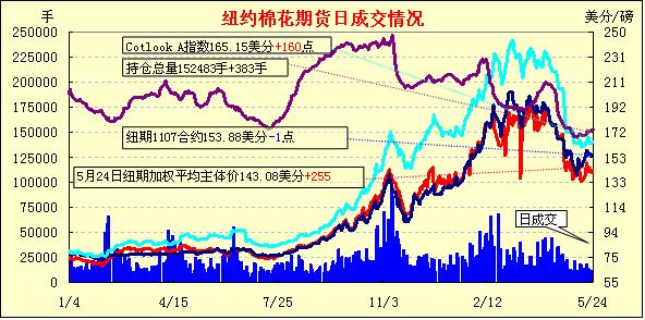 5月24日紐約期棉市場近期合約收平,其他合約強(qiáng)勢上漲,1112月合約封于漲停板,近期7月合約結(jié)算價(jià)153.88美分,跌1點(diǎn),1112月合約結(jié)算價(jià)125.76美分。受美元走弱、高盛和摩根士丹利均調(diào)高各自的油價(jià)預(yù)期值鼓舞商品市場強(qiáng)勢反彈推動,期棉市場穩(wěn)開高走,7月合約盤中上漲到157美分以上,12月合約震蕩上揚(yáng),盤中7月合約因轉(zhuǎn)倉交易受到打壓,遠(yuǎn)月合約則保持強(qiáng)勢。交易后期因美元反彈,商品期貨市場漲潮退去,但期棉因技術(shù)面12月合約形成突破并達(dá)到近兩周以來最高位,以及基本面美國最大產(chǎn)區(qū)德州持續(xù)干旱,遠(yuǎn)月合約保留高位,最終,7月合約基本收平,12月合約以漲停收盤。