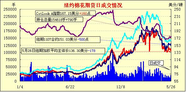 紐約期棉全線收陰近期合約跌停收盤(5-26)
