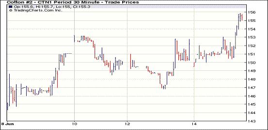 因經(jīng)濟(jì)面利好消息,6月14日紐約期棉受商業(yè)及投機(jī)買(mǎi)盤(pán)支持,近期合約大幅收漲。昨日中國(guó)國(guó)家統(tǒng)計(jì)局公布的數(shù)據(jù)顯示工業(yè)產(chǎn)值上升,促商品期貨市場(chǎng)走強(qiáng),特別是近一個(gè)月來(lái)低迷的美國(guó)原油市場(chǎng)有了反彈跡象。紐約期棉受到利好支撐,在買(mǎi)盤(pán)支持下多數(shù)合約走強(qiáng)。盤(pán)終7月合約收于155.54美分/磅,漲459點(diǎn);12月合約收于131.78美分/磅,漲20點(diǎn)。