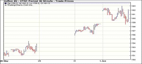 6月1日因美國(guó)德州天氣不佳,產(chǎn)量可能減少的支撐,紐約期棉承接前一日漲勢(shì),繼續(xù)上行,前四個(gè)合約收漲三位數(shù)。當(dāng)日市場(chǎng)開(kāi)盤(pán)后震蕩走高,盤(pán)中因商品市場(chǎng)整體弱勢(shì)以及投資者對(duì)全球需求的擔(dān)憂導(dǎo)致買(mǎi)盤(pán)撤離,主力12月合約回落至最低點(diǎn)131.94美分/磅。接近尾盤(pán)至買(mǎi)盤(pán)重新進(jìn)入市場(chǎng),促價(jià)格反彈,12月合約最高至138.48美分/磅。盤(pán)中近期7月合約收于160.97美分/磅,漲230點(diǎn);12月合約收于137.27美分/磅,漲177點(diǎn)。