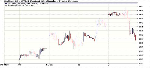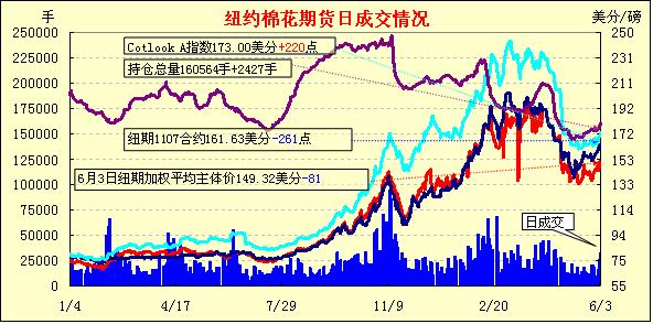 6月3日紐約期棉先揚(yáng)后抑,主力合約盤中達(dá)兩個(gè)月來(lái)高點(diǎn),最終收于低位。昨日市場(chǎng)開(kāi)盤走高,因美國(guó)天氣不佳,市場(chǎng)對(duì)下年度產(chǎn)量擔(dān)憂對(duì)棉市形成支撐。后雖然美國(guó)農(nóng)業(yè)部(USDA)公布至5月26日連續(xù)十周美陸地棉凈簽約為負(fù)數(shù),但期棉市場(chǎng)無(wú)視利空消息繼續(xù)上揚(yáng)。盤中主力12月合約最高達(dá)140.90美分/磅,為兩月來(lái)高點(diǎn)(4月初高點(diǎn)144.66美分/磅)。接近尾盤時(shí)市場(chǎng)買盤跟進(jìn)不足,價(jià)格回落,最終全面收跌。近期7月合約收于161.63美分/磅,跌261點(diǎn);12月合約收于138.70美分/磅,跌82點(diǎn)。