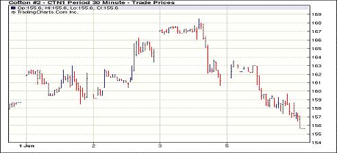 6月6日紐約期棉受外圍市場(chǎng)拖拽,整體弱勢(shì),近期7月合約收于跌停板。當(dāng)日市場(chǎng)高開低走,指數(shù)基金平倉(cāng)加之轉(zhuǎn)倉(cāng)交易對(duì)近期合約造成打壓,同時(shí)外圍商品市場(chǎng)及金融市場(chǎng)普遍弱勢(shì),期棉前四個(gè)合約收跌百點(diǎn)以上。其中近期7月合約收于155.63美分/磅,跌600點(diǎn);12月合約收于136.93美分/磅,跌177點(diǎn)。